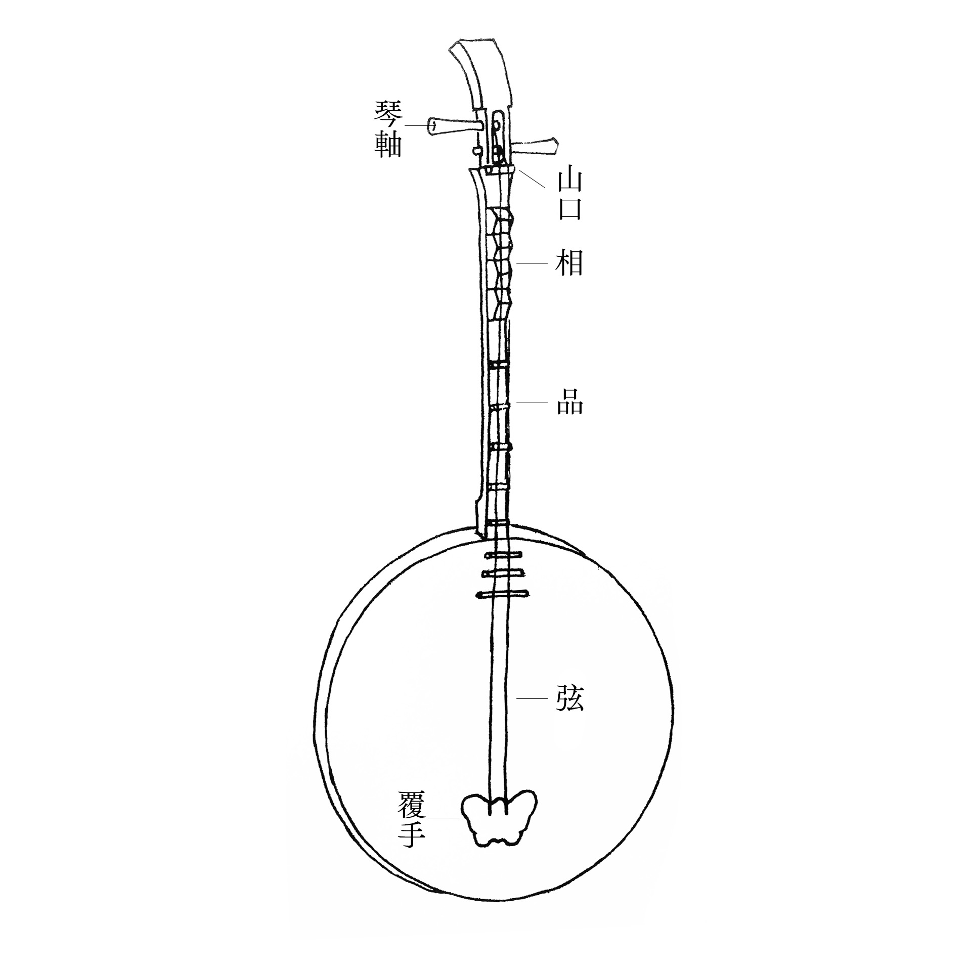 撥奏弦鳴樂器(Plucked string instrument),兩條絃,長柄,音箱為木製圓形。